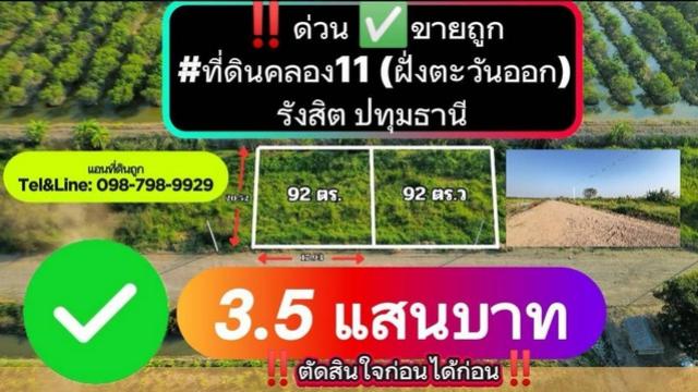 ด่วน ขายถูก #ที่ดินคลอง11 (ฝั่งตะวันออก)รังสิต ปทุมธานี 92 ตร.ว. 3.5 แสน ตัดสินใจก่อนได้ก่อน